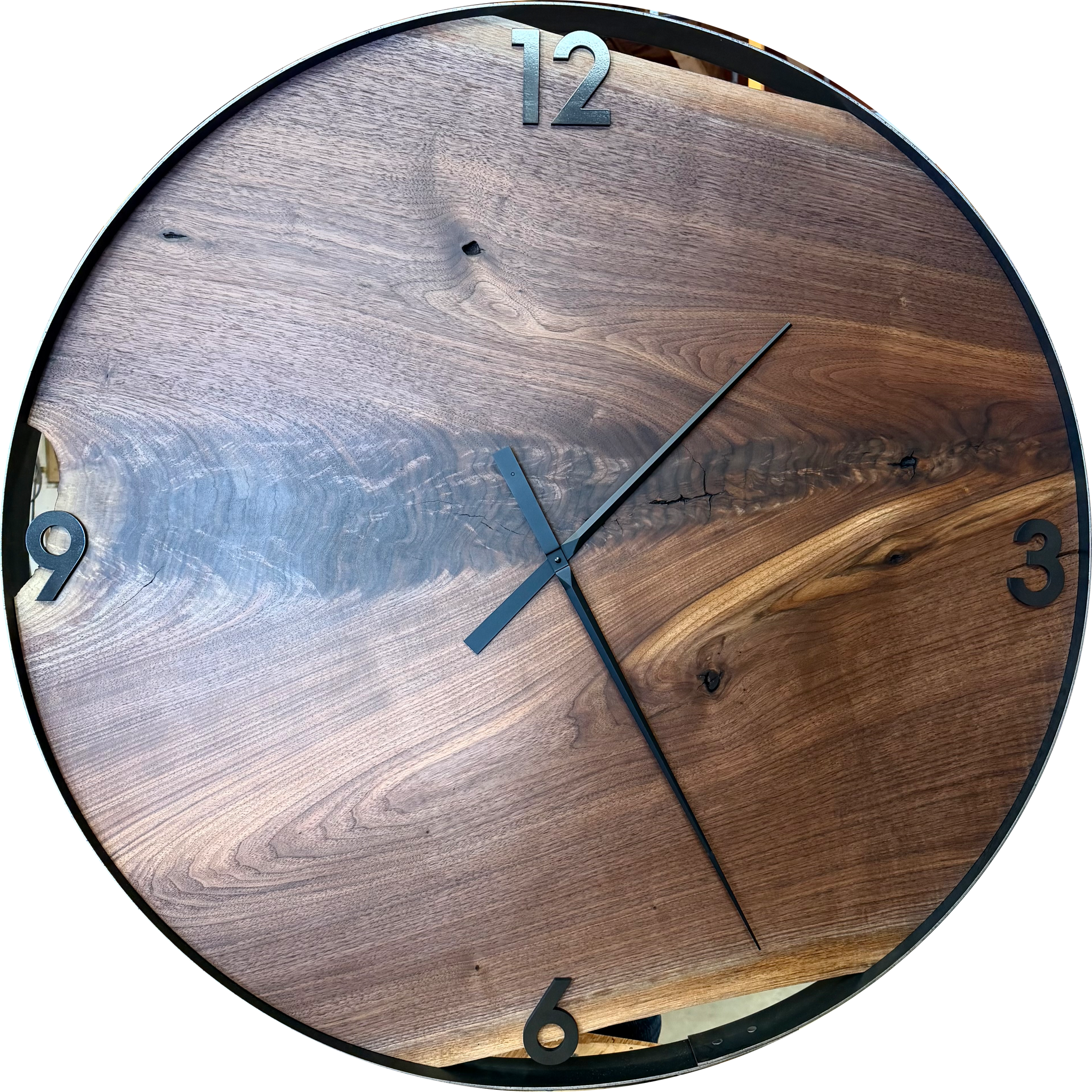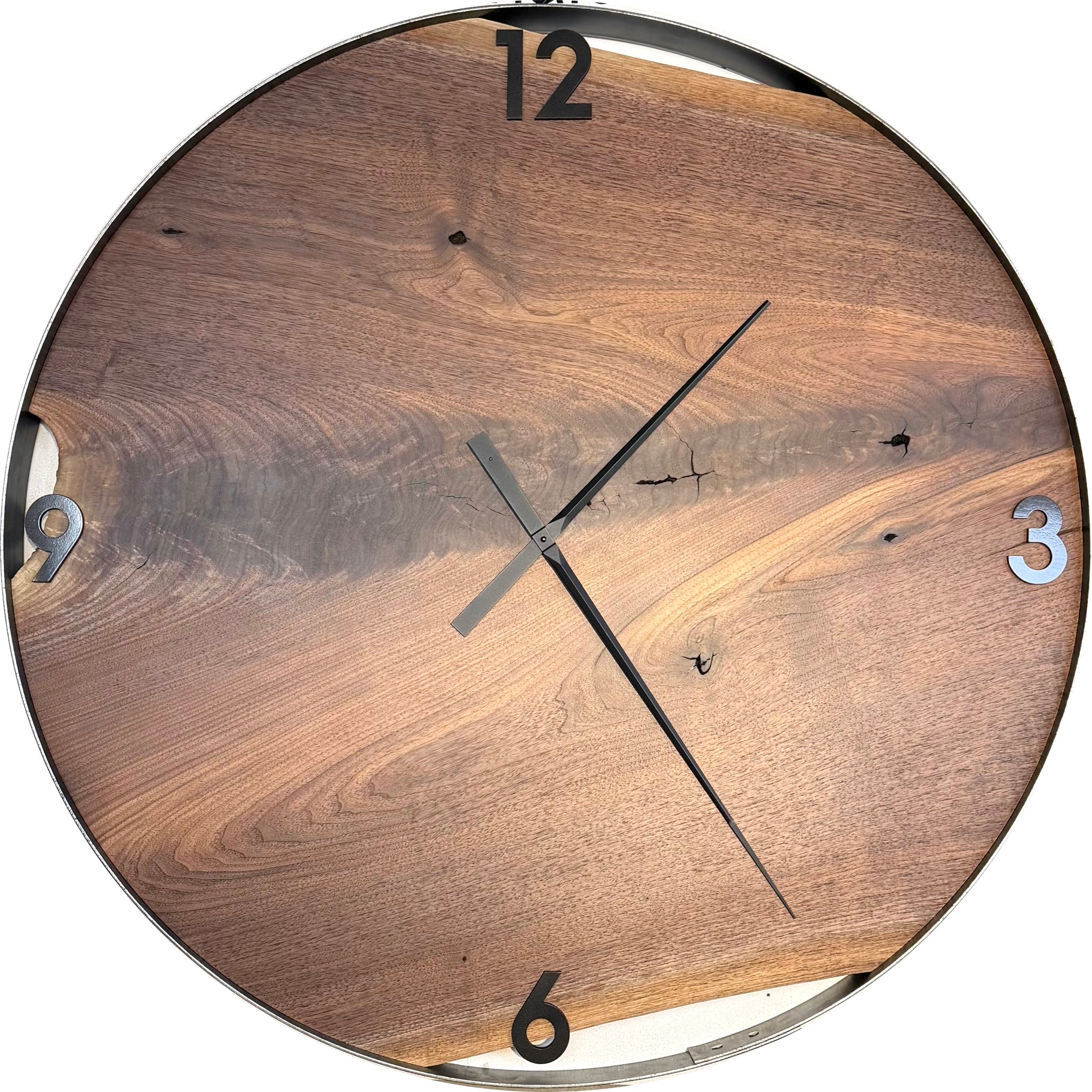 Each clock is custom, and you will have the ability to choose all the details along the way. We currently have stock of Black Walnut live edge wood that is suitable for this large size. Choose epoxy (and colour) or choose no epoxy and your number style.